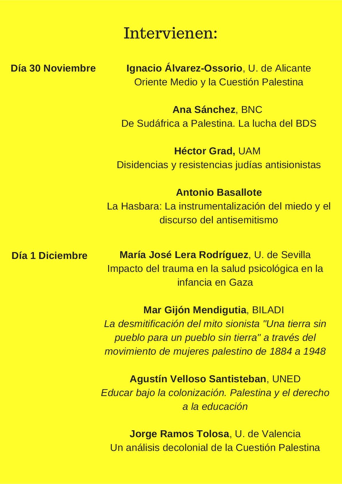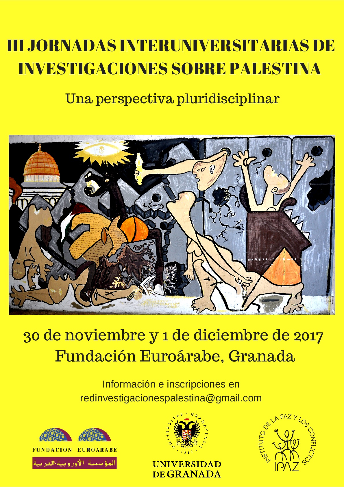 Se celebrarán en la Fundación Euroárabe de Granada los días 30 de noviembre y 1 de diciembre de 2017. Estas jornadas tienen como finalidad la generación de un espacio de intercambio académico entre investigadores/as que trabajen cuestiones relacionadas con Palestina para facilitar un proceso formativo a partir de la transferencia de conocimientos y el debate científico. Las mismas continúan los encuentros de carácter pluridisciplinar que se vienen realizando durante los últimos años con el propósito de compartir las últimas investigaciones sobre Palestina realizadas desde la academia española.