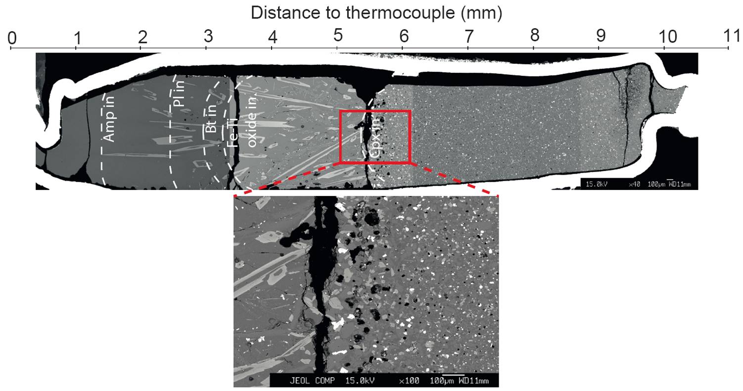 En los estudios experimentales de diferenciación magmática se han empleado cápsulas diseñadas especialmente para simular la completa cristalización de un magma en un sistema cerrado y a una presión constante. Se han elegido distintas tasas de enfriamiento teniendo en cuenta factores cinéticos de escala con el fin de reproducir las condiciones más cercanas al equilibrio. Concretamente, se establecieron dos tasas de cristalización distintas, una rápida (9.6 ºC/hora) y otra lenta (0.6 ºC/hora) con el fin de identificar posibles efectos cinéticos en los procesos de diferenciación.