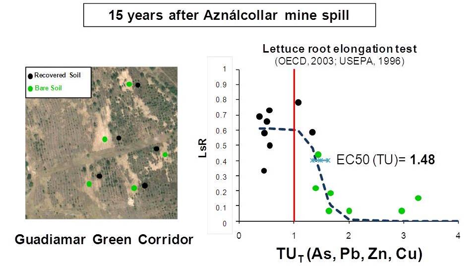Los datos obtenidos de los bioensayos en los capítulos 3-6 se comparan con la legislación vigente y con los efectos observados en los suelos naturales contaminados de Aznalcóllar. Los resultados obtenidos (capítulo 8) muestran que los valores de referencia existentes en Andalucía (Decreto 18/2015), donde se encuentra localizada la zona de estudio, no son suficientemente precisos para declarar un suelo como contaminado y, por lo tanto, el riesgo de contaminación podría estar sobrestimado o subestimado en función del elemento considerado. Las grandes diferencias en los valores obtenidos se deben a la gran diversidad de tipos de suelo. Por lo tanto, y a la vista de todo lo expuesto, para una adecuada evaluación de riesgos ecológicos, concretamente por contaminación metálica en suelos, es esencial un nuevo enfoque que tenga en cuenta las propiedades del suelo. En consecuencia, para desarrollar una legislación realmente eficiente y útil, la regulación actual debería ser revisada aplicando los resultados obtenidos en esta tesis.